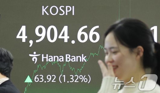 (서울=뉴스1) 박지혜 기자 = 코스피가 사상 첫 4900선을 돌파한 19일 서울 중구 하나은행 본점 딜링룸 전광판에 종가 현황이 나타나고 있다. 이날 코스피는 전장보다 63.92포인트(1.32%) 오른 4,904.66에 장을 마치며 종가 기준 사상 최고치를 또 경신했다. 2026.1.19/뉴스1