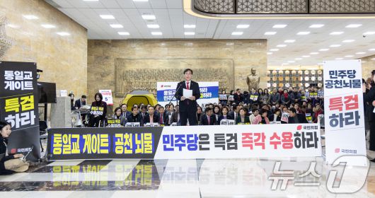 (서울=뉴스1) 이승배 기자 = 송언석 국민의힘 원내대표가 19일 서울 여의도 국회 로텐더홀에서 열린 통일교 게이트·더불어민주당 공천뇌물 특검 촉구 규탄대회에서 발언하고 있다. 2026.1.19/뉴스1photolee@news1.krCopyright ⓒ 뉴스1. All rights reserved. 무단 전재 및 재배포, AI학습 이용 금지.