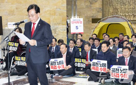 (서울=뉴스1) 이승배 기자 = 장동혁 국민의힘 대표가 19일 서울 여의도 국회 로텐더홀에서 열린 통일교 게이트·더불어민주당 공천뇌물 특검 촉구 규탄대회에 참석해 구호를 외치고 있다. 2026.1.19/뉴스1photolee@news1.krCopyright ⓒ 뉴스1. All rights reserved. 무단 전재 및 재배포, AI학습 이용 금지.