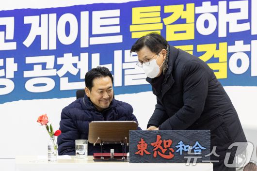 (서울=뉴스1) 이승배 기자 = 더불어민주당의 통일교 및 공천뇌물 특검 수용을 촉구하며 5일째 단식을 이어가고 있는 장동혁 국민의힘 대표가 19일 서울 여의도 국회 로텐더홀에서 황교안 전 국무총리와 대화하고 있다. 2026.1.19/뉴스1photolee@news1.krCopyright ⓒ 뉴스1. All rights reserved. 무단 전재 및 재배포, AI학습 이용 금지.