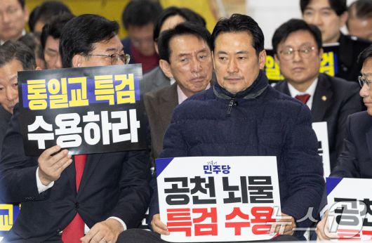 (서울=뉴스1) 이승배 기자 = 장동혁 국민의힘 대표, 송언석 원내대표를 비롯한 의원들이 19일 서울 여의도 국회 로텐더홀에서 열린 통일교 게이트·더불어민주당 공천뇌물 특검 촉구 규탄대회에서 대화를 나누고 있다. 2026.1.19/뉴스1photolee@news1.krCopyright ⓒ 뉴스1. All rights reserved. 무단 전재 및 재배포, AI학습 이용 금지.
