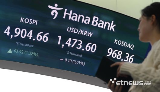 코스피 지수가 사상 최초로 장중 4900선을 돌파했다. 새해 들어 하루도 빠짐없이 오르며 12거래일 연속 사상 최고치를 새로 쓰고 있다. 19일 코스피는 전 거래일 보다 63.92포인트 오른 4904.66, 코스닥은 13.77 포인트 오른 968.36을 기록하며 장을 마감했다. 서울 중구 하나은행 딜링룸에서 딜러가 업무를 보고 있다. 이동근기자 foto@etnews.com |