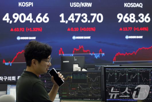 (서울=뉴스1) 박정호 기자 = 19일 오후 서울 중구 우리은행 본점 딜링룸 전광판에 종가가 표시되고 있다. 이날 코스피는 전 거래일 대비 63.92포인트(1.32%) 오른 4904.66, 코스닥은 77.90포인트(1.44%) 오른 969.09으로 장을 마쳤다. 오후 3시 30분 서울외환시장에서 달러·원 환율은 전일 오후 3시 30분 주간종가 대비 0.1원 오른 1473.7원을 기록했다. 2026.1.19/뉴스1