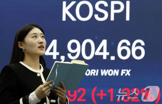 (서울=뉴스1) 박정호 기자 = 19일 오후 서울 중구 우리은행 본점 딜링룸 전광판에 종가가 표시되고 있다. 이날 코스피는 전 거래일 대비 63.92포인트(1.32%) 오른 4904.66, 코스닥은 77.90포인트(1.44%) 오른 969.09으로 장을 마쳤다. 오후 3시 30분 서울외환시장에서 달러·원 환율은 전일 오후 3시 30분 주간종가 대비 0.1원 오른 1473.7원을 기록했다. 2026.1.19/뉴스1