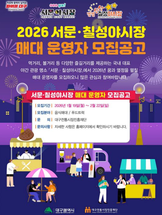 모집 인원은 총 52명으로, 서문야시장 30명(음식매대 24명·푸드트럭 6명), 칠성야시장 22명(음식매대 18명·푸드트럭 4명)이다.