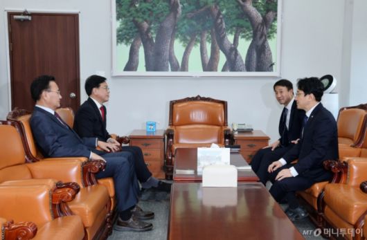 [서울=뉴시스] 조성봉 기자 = 한병도 더불어민주당 원내대표와 송언석 국민의힘 원내대표가 19일 오후 서울 여의도 국회 운영위원장실에서 열린 여야 원내대표 회동에서 대화를 하고 있다. 왼쪽부터 유상범 원내운영수석부대표, 송 원내대표, 한 원내대표, 천준호 민주당 원내운영수석부대표. (공동취재) 2025.01.19. photo@newsis.com /사진= |