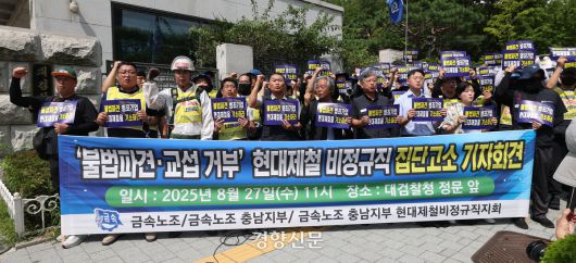 민주노총 금속노조 충남지부 현대제철비정규직지회 소속 노동자들이 서울 서초구 대검찰청 앞에서 ‘불법파견·교섭거부’ 현대제철 비정규직 집단 고소 기자회견을 하고 있다. 2025.8.27 권도현 기자 |
