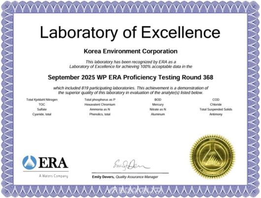 한국환경공단이 미국 환경자원협회(ERA, Environmental Resource Associate)가 주관하는 2025년도 국제숙련도시험에서 14년 연속 ‘최우수 분석기관(Laboratory of Excellence)’으로 선정됐다. 한국환경공단 제공 |