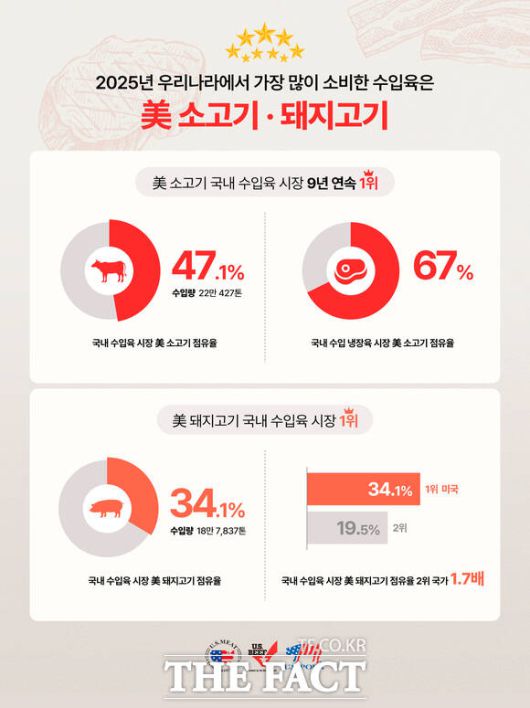 [더팩트ㅣ유연석 기자] 미국산 소고기가 2025년 국내 수입육 시장에서 점유율 47.1%를 달성하며 9년 연속 1위를 차지했다. 미국산 돼지고기 또한 점유율 34.1%를 기록하며 확고한 1위에 올랐다.