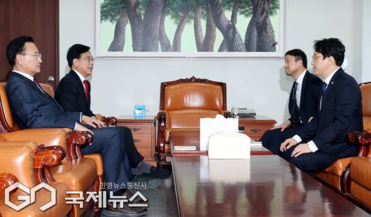 (서울=국제뉴스) 한병도 더불어민주당 원내대표와 송언석 국민의힘 원내대표가 19일 오후 서울 여의도 국회 운영위원장실에서 열린 여야 원내대표 회동에서 대화를 하고 있다. 왼쪽부터 유상범 원내운영수석부대표, 송 원내대표, 한 원내대표, 천준호 민주당 원내운영수석부대표./사진=이용우 기자