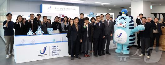 (서울=뉴스1) = 최휘영 문화체육관광부 장관이 19일 세종시 2027 충청 유니버시아드대회 조직위원회를 방문해 강창희 조직위원장을 비롯한 조직위 직원들과 함께 기념촬영을 하고 있다. (문화체육관광부 제공. 재판매 및 DB 금지) 2026.1.19/뉴스1