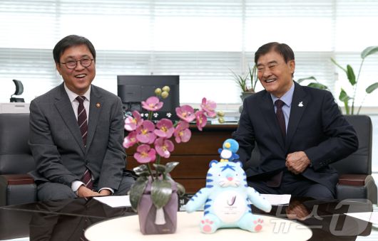 (서울=뉴스1) = 최휘영 문화체육관광부 장관이 19일 세종시 2027 충청 유니버시아드대회 조직위원회를 방문해 강창희 조직위원장과 면담을 하고 있다. (문화체육관광부 제공. 재판매 및 DB 금지) 2026.1.19/뉴스1urodoct2@news1.krCopyright ⓒ 뉴스1. All rights reserved. 무단 전재 및 재배포, AI학습 이용 금지.