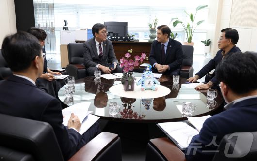 (서울=뉴스1) = 최휘영 문화체육관광부 장관이 19일 세종시 2027 충청 유니버시아드대회 조직위원회를 방문해 강창희 조직위원장과 면담을 하고 있다. (문화체육관광부 제공. 재판매 및 DB 금지) 2026.1.19/뉴스1