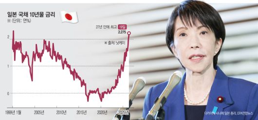 일본 채권 가격은 하락했다. 일본 장기금리 지표인 국채 10년물 금리는 이날 한때 2.275%까지 상승했다. 이는 1999년 2월 이후 약 27년 만에 최고 수준이다. 채권 금리와 가격은 반대로 움직인다. 다키이치 총리가 적극적인 경기부양책을 펼치면 재정이 악화할 것이라는 우려가 커지면서 채권 매도세가 가속했다. 닛케이는 “조기 총선에서 여당이 승리하면 다카이치 내각이 적극적 재정정책을 펼칠 것이라는 시장 심리가 작용했다”며 “여기에 여야 모두 식료품 소비세 감세 등 재정 악화를 초래할 공약을 검토하고 있다”고 설명했다.