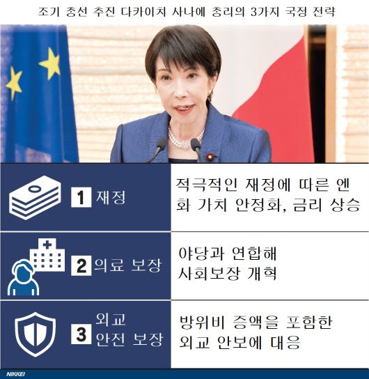 다카이치 사나에 일본 총리가 권력 기반을 공고히 하기 위해 ‘조기 총선거’ 카드를 꺼내 들자 정국이 요동치고 있다. 중도층 확보를 위한 여야 신경전이 본격화하는 한편 새 내각이 추진할 것으로 예상되는 대규모 경기부양책에 시장에서 이른바 ‘다카이치 트레이드’도 나타나고 있다.