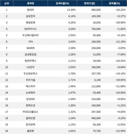 이어 검색비율 2위의 삼성전자(005930)는 등락률 0.27%로 약보합세로 마감했다. 검색비율 3위의 휴림로봇(090710)은 상한가로 마감했다. 검색비율 4위 SK하이닉스(000660)는 1.06% 상승 마감했다. 검색비율 5위 두산에너빌리티(034020)는 0.10% 상승하며 보합세로 마감했다.