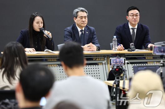 (서울=뉴스1) 김도우 기자 = 윤석열 전 대통령측 변호인단(왼쪽부터 유정화, 송진화, 최지우 변호사)이 19일 서울 서초구 한 사무실에서 기자회견을 열고 윤 전 대통령의 체포방해 혐의 징역 5년 선고에 대한 입장을 밝히고 있다. 2026.1.19/뉴스1pizza@news1.krCopyright ⓒ 뉴스1. All rights reserved. 무단 전재 및 재배포, AI학습 이용 금지.