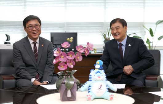 [서울=뉴스핌] 김용석 기자 = 최휘영 문화체육관광부 장관이 19일 세종시 2027 충청 유니버시아드대회 조직위원회를 방문해 강창희 조직위원장과 면담을 하고 있다.[사진= 문체부] 2026.01.19 fineview@newspim.com |