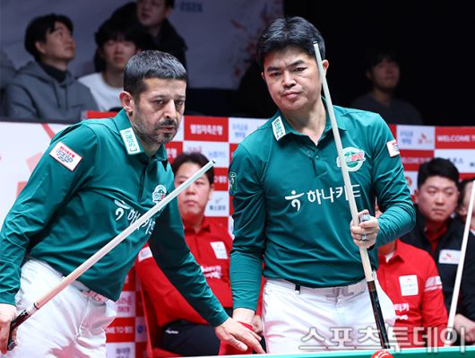 [고양(경기)=스포츠투데이 팽현준 기자] 19일 경기도 고양 킨텍스 PBA스타디움에서 열린 '웰컴저축은행 PBA 팀리그 2025-2026' SK렌터카와 하나카드의 챔피언결정전 1차전, 공격을 성공한 하나카드 초클루와 응우옌꾸옥응우옌이 손바닥을 맞대고 있다. 2026.01.19. [스포츠투데이 팽현준 기자 sports@stoo.com]