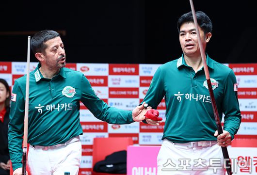 [고양(경기)=스포츠투데이 팽현준 기자] 19일 경기도 고양 킨텍스 PBA스타디움에서 열린 '웰컴저축은행 PBA 팀리그 2025-2026' SK렌터카와 하나카드의 챔피언결정전 1차전, 하나카드 초클루와 응우옌꾸옥응우옌이 의견을 나누고 있다. 2026.01.19. [스포츠투데이 팽현준 기자 sports@stoo.com]