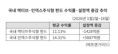 19일 금융정보업체 에프앤가이드에 따르면 새해 들어(1월2일~16일) 국내 액티브주식형 펀드 설정액은 1428억원이 빠져나갔다. 같은 기간 코스피200지수 등을 추종하는 국내 인덱스주식형 펀드에 5887억원이 유입된 것과는 대비된다.