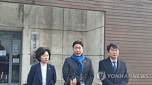 (천안=연합뉴스) 유의주 기자 = 19일 독립기념관 밝은누리관 앞에서 독립기념관 이사인 민주당 송옥주, 김용만, 문진석 의원(왼쪽부터)이 이사회 결과를 설명하고 있다. 2026.1.19