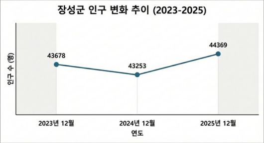 (장성=국제뉴스) 류연선 기자 = 장성군은 지난해 12월 기준 인구가 4만 4369명으로 집계돼 1년 전보다 1116명 늘어났다고 밝혔다.