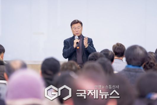 (성남=국제뉴스) 손창민 기자 = 신상진 성남시장이 19일 오전 성남시청 2층 모란관에서 열린 '여수동 복합문화시설 착공 주민설명회'에 참석해 인사말을 하고 있다.