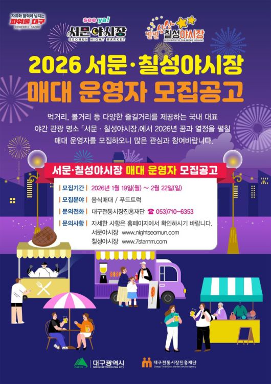[대구=뉴스핌] 김용락 기자=대구광역시와 대구전통시장진흥재단은 오는 3월 말 서문·칠성야시장 개장을 앞두고, 전국에서 모여드는 방문객의 입맛을 사로잡을 열정 가득한 매대 운영자를 공개 모집한다. 올해 서문·칠성야시장을 미식 축제의 장으로 만들어줄 매대 운영자 모집인원은 총 52명으로, ▲서문야시장 30명(음식매대 24명, 푸드트럭 6명) ▲칠성야시장 22명(음식매대 18명, 푸드트럭 4명)이다.