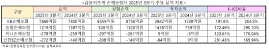 19일 한국금융신문이 금융지주계 손해보험사(KB손해보험·농협손해보험·하나손해보험·신한EZ손해보험)의 2025년 3분기 경영공시를 분석한 결과, 보험 부문의 예실차 확대로 손익이 감소하면서 전반적으로 실적이 악화된 것으로 나타났다.