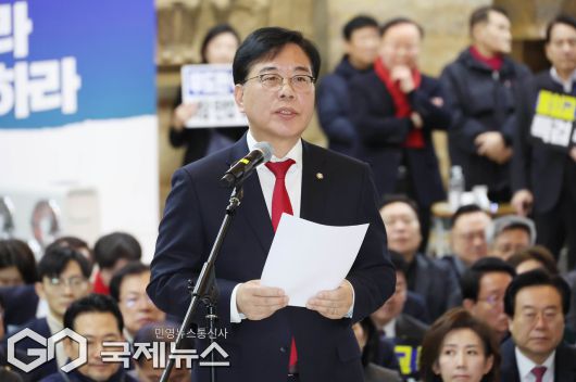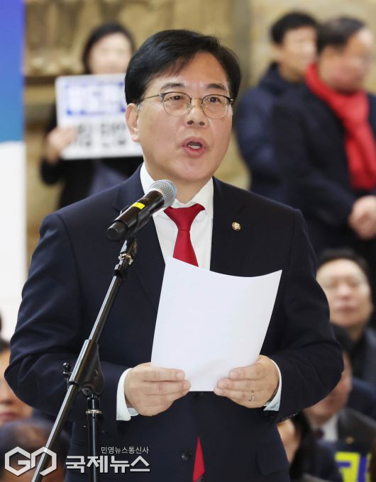 (서울=국제뉴스) 송언석 국민의힘 원내대표가 19일 서울 여의도 국회 로텐더홀에서 열린 '통일교 게이트·더불어민주당 공천뇌물 특검 촉구 규탄대회'에서 발언을 하고 있다./사진=이용우 기자