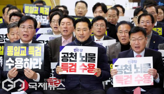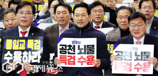 (서울=국제뉴스) 장동혁 국민의힘 대표, 송언석 원내대표를 비롯한 의원들이 19일 서울 여의도 국회 로텐더홀에서 열린 '통일교 게이트·더불어민주당 공천뇌물 특검 촉구 규탄대회'에서 구호를 외치고 있다./사진=이용우 기자