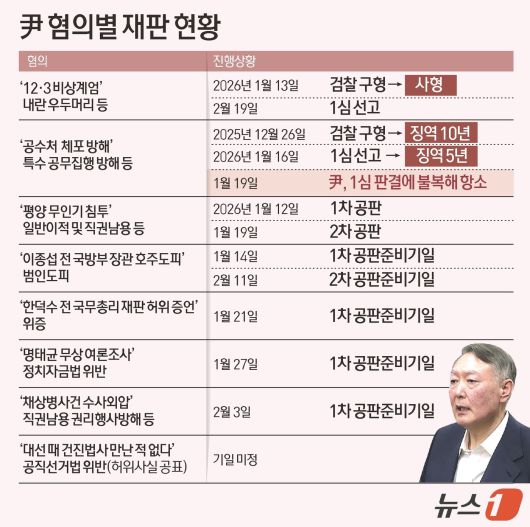 (서울=뉴스1) 김초희 디자이너 = 체포 방해와 국무위원 심의권 침해 등 혐의로 1심에서 징역 5년을 선고받은 윤석열 전 대통령이 판결에 불복해 항소했다. 윤 전 대통령 측은 19일 오후 4시쯤 서울중앙지법 형사합의35부(부장판사 백대현)에 항소장을 제출했다고 밝혔다. 지난 16일 1심 선고가 나온 지 3일 만이다.