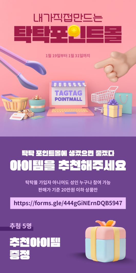 본 이벤트는 1월 19일부터 1월 31일까지 진행된다. 탁탁몰 가입자가 아닌 고객이라도 성인이라면 누구나 참여가 가능하며, 판매가 기준 20만원 이하의 제품만 추천할 수 있다. 추첨을 통해 당첨된 5명에게는 추천한 아이템을 선물로 증정한다. 단, 제세 공과금은 본인 부담으로 진행된다.