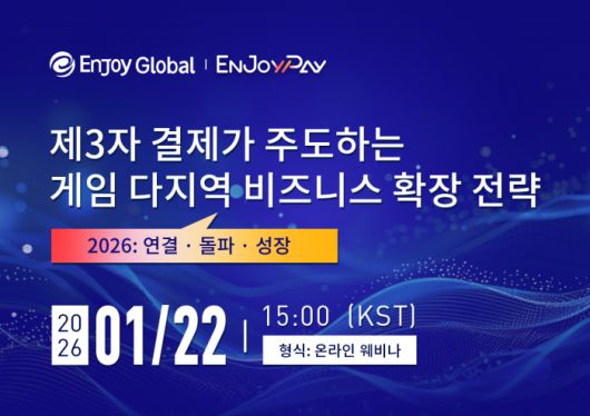 EnjoyPay는 오는 2026년 1월 22일 오후 3시(KST), ‘제3자 결제가 주도하는 게임 다지역 비즈니스 확장 전략’을 주제로 온라인 웨비나를 개최할 예정이다. 이번 웨비나는 글로벌 주요 플랫폼의 결제 정책 변화 흐름 속에서, 게임 기업이 제3자 결제를 통해 글로벌 시장에서 실질적인 성장 기회를 확보하는 전략을 공유하기 위해 마련됐다.