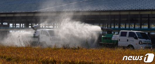 경북 포항시 축산방역팀이 축협공동방제단과 함께 북구 기계면 한우농장에서방역 작업을 하고 있는 모습. (뉴스 1 자료, 재판매 및 DB금지) ⓒ News1 최창호 기자 |