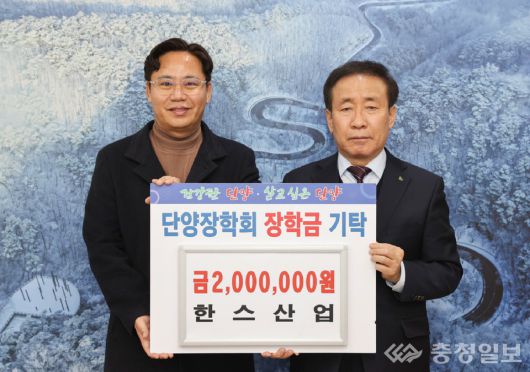 한스산업이 충북 단양 지역 인재 양성을 위해 장학금 200만원을 기부했다. 19일 단양장학회에 따르면 한효정 한스산업 대표는 명문 학교 육성과 미래 인재 양성을 응원하는 뜻을 담아 장학금을 기탁했다. 장학금은 지역 내 학생들의 학업 지원과 장학사업에 사용될 예정이다./단양=목성균기자