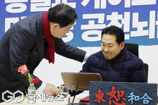 (서울=국제뉴스) 더불어민주당의 통일교 및 공천뇌물 특검 수용을 촉구하며 5일째 단식을 이어가고 있는 장동혁 국민의힘 대표가 19일 서울 여의도 국회 로텐더홀에서 최경환 전 경제부총리와 대화하고 있다./사진=이용우 기자