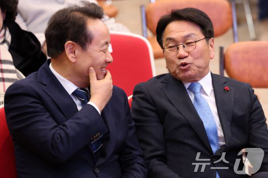 (광주=뉴스1) 이승현 기자 = 19일 오후 광주 동구청사 6층 대회의실에서 열린 광주·전남 대통합 동구 권역 시민공청회에서 강기정 광주시장과 임택 동구청장이 대화하고 있다. 2026.1.19/뉴스1pepper@news1.krCopyright ⓒ 뉴스1. All rights reserved. 무단 전재 및 재배포, AI학습 이용 금지.