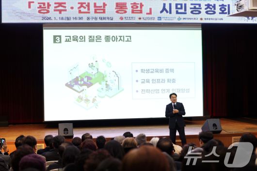(광주=뉴스1) 이승현 기자 = 강기정 광주시장이 19일 오후 광주 동구청사 6층 대회의실에서 열린 광주·전남 대통합 동구 권역 시민공청회에서 행정통합에 대해 설명하고 있다. 2026.1.19/뉴스1