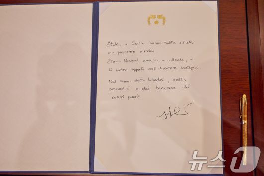 (서울=뉴스1) 허경 기자 = 조르자 멜로니 이탈리아 총리가 19일 청와대에서 방명록에 작성한 글. (청와대 제공. 재판매 및 DB 금지) 2026.1.19/뉴스1neohk@news1.krCopyright ⓒ 뉴스1. All rights reserved. 무단 전재 및 재배포, AI학습 이용 금지.