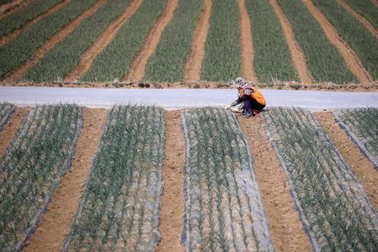 대구 달성군 구지면 한 양파밭에서 한 할머니가 겨우내 보온 비닐 아래서 싹을 틔운 양파 싹을 뽑아 올리고 있다. 2025.3.20/뉴스1 |