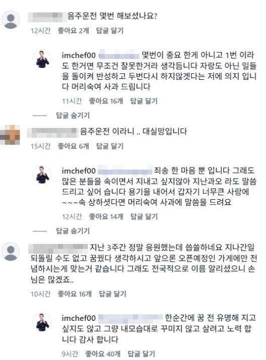 또 다른 누리꾼이 "음주운전 3번은 할 말이 없네요"라고 지적하자 그는 "많이 혼내주세요 죄송합니다"라고 짧지만 무거운 사과를 전했다.