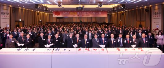 (서울=뉴스1) = 중소기업중앙회는 19일 웨스틴조선 부산에서 영남권 중소기업을 비롯한 경제계와 정부·국회·지자체·유관기관 등 주요 인사 600여명이 참석한 가운데 '2026 영남권 중소기업인 신년인사회'를 개최했다고 밝혔다. 사진은 신년인사회 참석자들이 떡케이크 컷팅 세리머니를 하는 모습. (중소기업중앙회 제공. 재판매 및 DB 금지) 2026.1.19/뉴스1