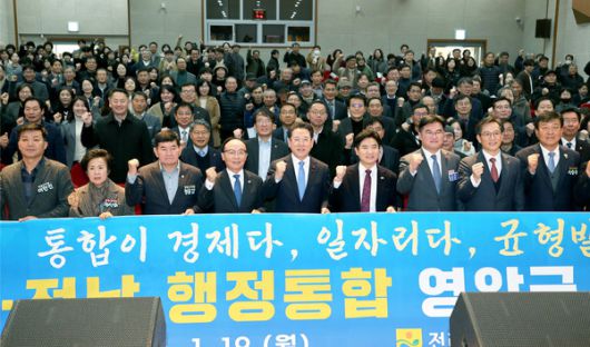 (전남=국제뉴스) 김성산 기자 = 김영록 전라남도지사가 19일 영암청소년센터에서 열린 광주·전남 행정통합 도민공청회에서 김대중 전남교육감, 우승희 영암군수 등 도민들과 기념 촬영을 하고 있다.