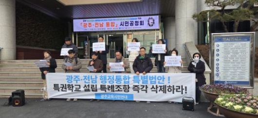 광주교육시민연대는 19일 오후 동구청 앞에서 기자회견을 열고 "광주전남특별시 설치를 위한 특별법안의 자율학교, 영재학교, 특수목적고등학교, 외국교육기관 등의 특례 조항으로 특별시교육감이 직접 여러 형태의 학교를 설립할 수 있도록 하고 있다"며 "교육기관 설립에 특례를 남용하는 것은 법체계를 흔들고, 교육 정책의 일관성을 무너뜨릴 수 있다"며 이같이 밝혔다.