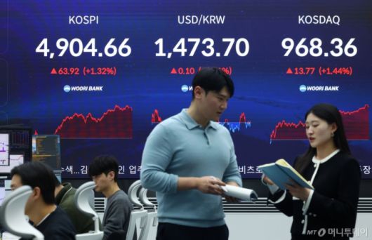 [서울=뉴시스] 황준선 기자 = 코스피가 전 거래일(4840.74)보다 63.92포인트(1.32%) 오른 4904.66에 마감한 19일 오후 서울 중구 우리은행 본점 딜링룸에 지수가 표시돼 있다. 코스닥 지수는 전 거래일(954.59)보다 13.77포인트(1.44%) 상승한 968.36에 거래를 마쳤다. 원·달러 환율은 전 거래일(1473.6원)보다 0.1원 오른 1473.7원에 주간 거래를 마감했다. 2026.01.19. |