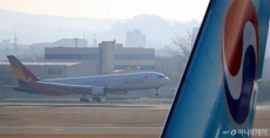 2020년 11월 서울 강서구 김포공항 계류장에 대한항공과 아시아나항공 여객기가 활주로를 향해 이동하고 있다. /사진=머니투데이. |