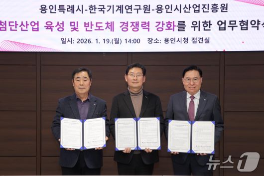 (용인=뉴스1) 김평석 기자 = 경기 용인시가 19일 시청 접견실에서 한국기계연구원(KIMM)·용인시산업진흥원과 ‘첨단산업 육성 및 반도체 경쟁력 강화를 위한 업무협약’을 체결했다.