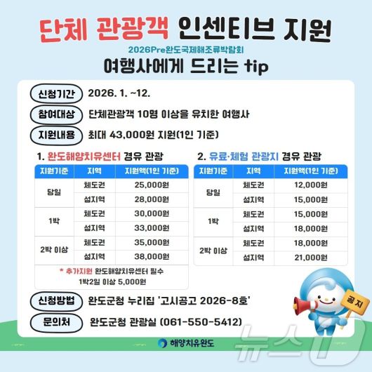 지원 기준은 내·외국인 단체 관광객 10명 이상 유치 시 당일 기준 체도(육지)권은 1인 당 1만 2000원, 섬 지역은 1만 5000원이 지원된다.